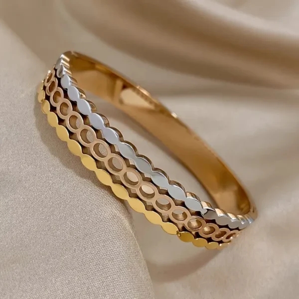 Tricolor Spliced Wave Dot Three-Layer Stainless Steel Bracelet, a Stylish Metal Hand Accessory for a Chic Stacked Look