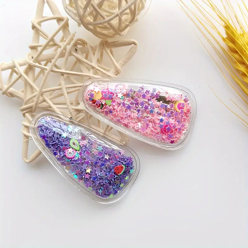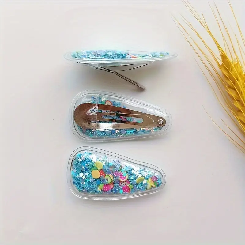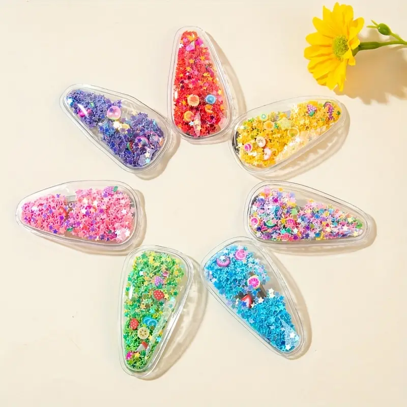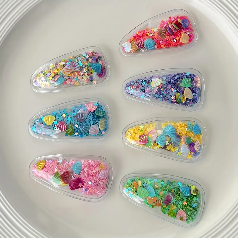 Brighten up any hairstyle with this fun, versatile set of transparent quicksand hair clips! Each clip is filled with sparkling sequins and charms—star fruit, shells, bubbles, drops—for a playful, DIY-inspired aesthetic. Perfect for ages 14 and up.