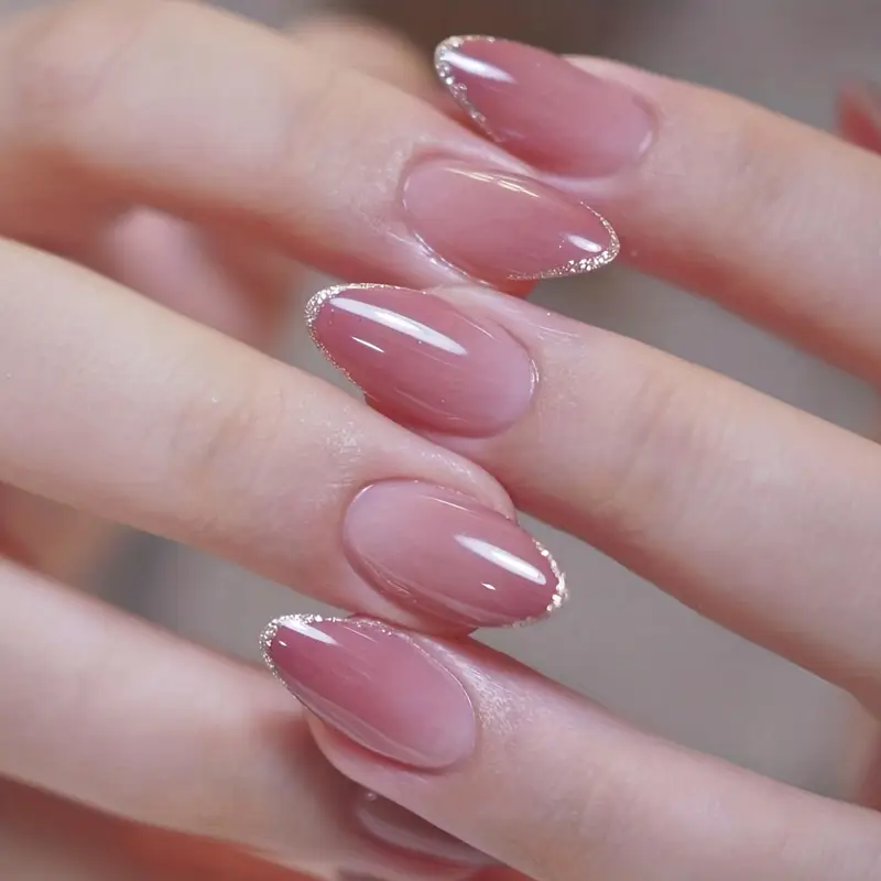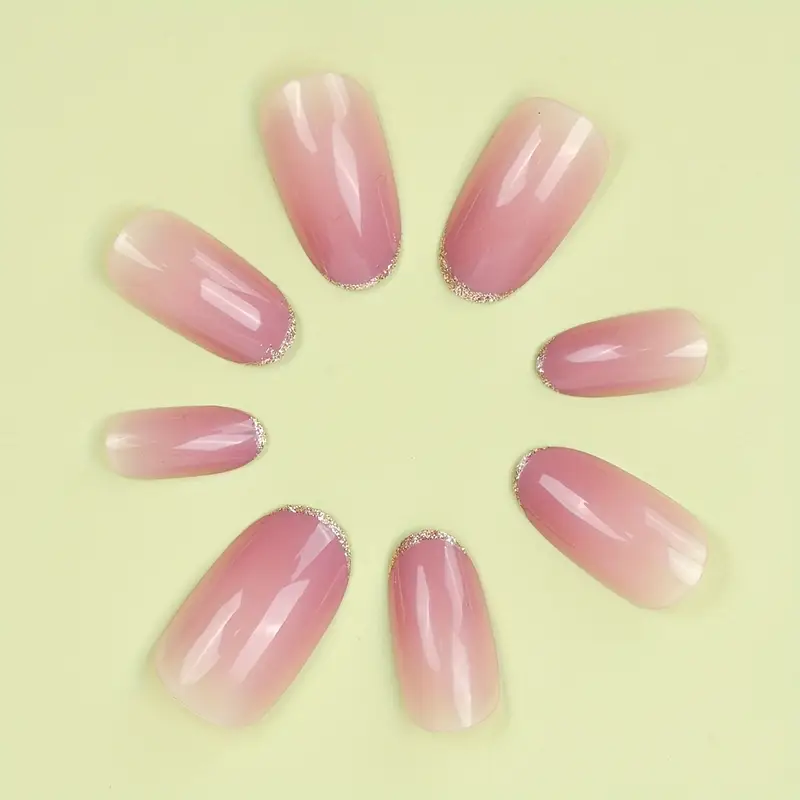 Elevate your everyday or party look with these elegant 24pcs Glossy Medium Oval Press-On Nails. Featuring a chic nude-to-pink gradient and glittery French tip design, these minimalist-style false nails offer a salon-quality finish in minutes. Perfect for both women and girls, they provide a secure fit, comfortable wear, and effortless beauty for any occasion.