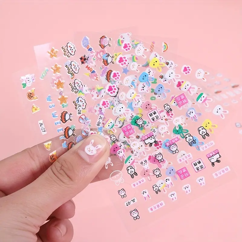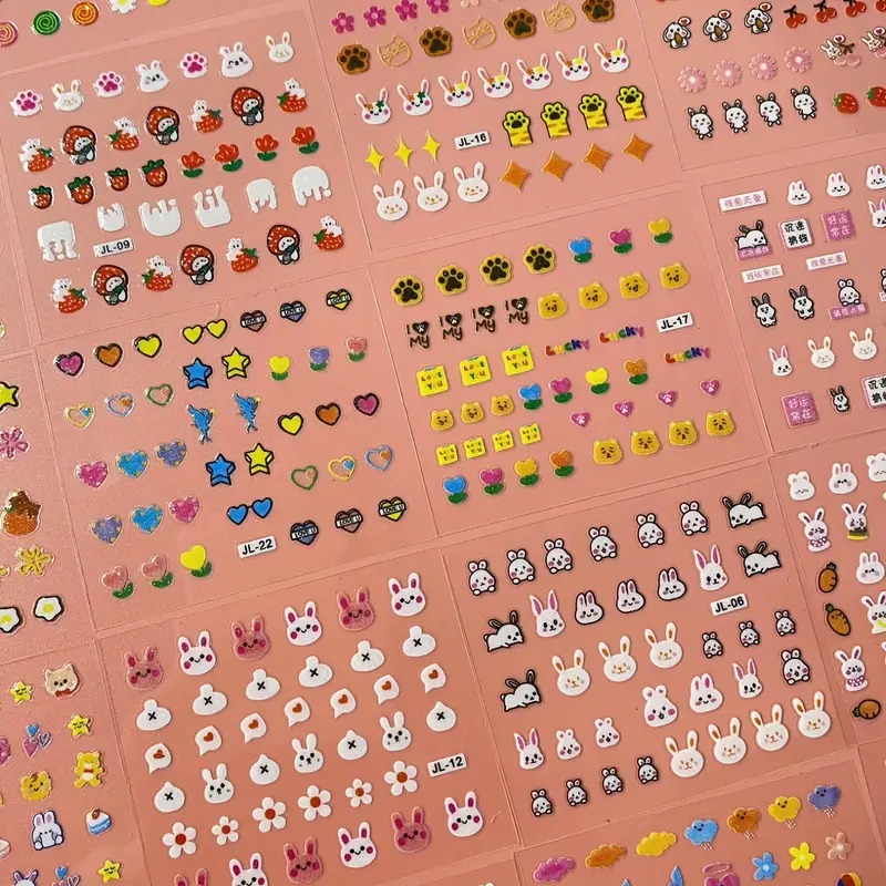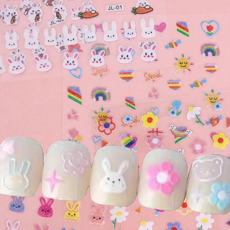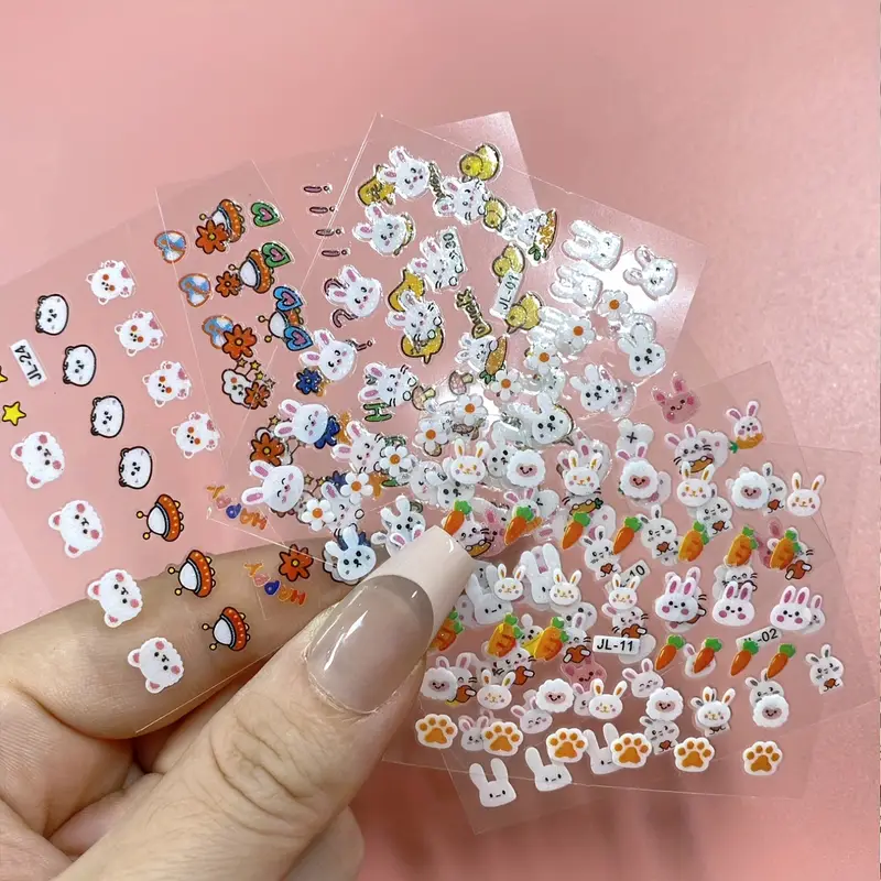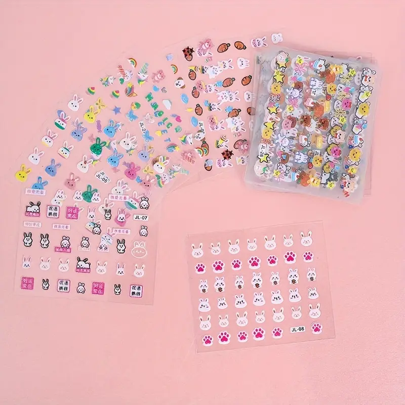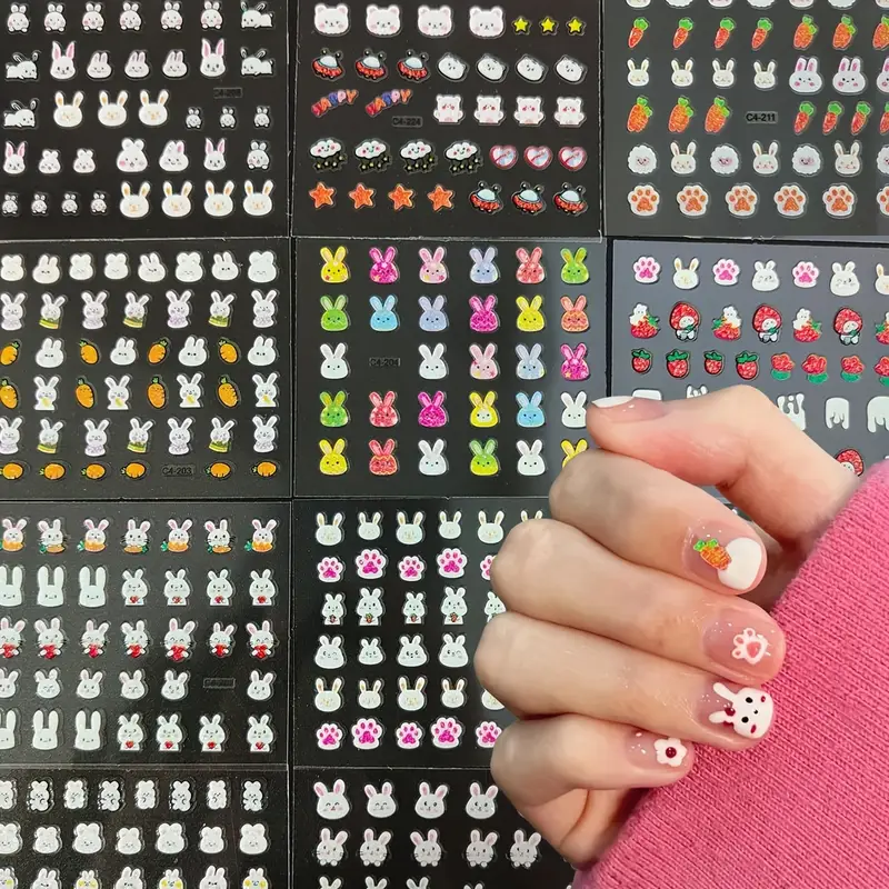 Cute Bunny Cartoon Design: 3D plastic stickers featuring adorable bunny characters, perfect for whimsical nail art