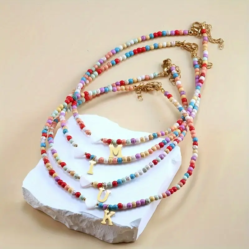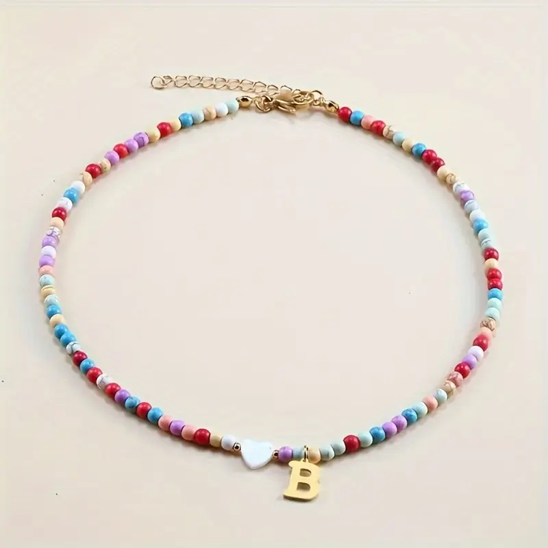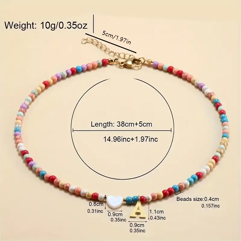 Elevate your everyday look with this enchanting Boho-chic necklace, featuring a heart-shaped synthetic turquoise pendant adorned with 26 delicate English letter charms. The vibrant blue-green heart is beautifully framed by glossy beads and finished with luxurious 18K gold plating—perfect for those who love a touch of vintage elegance in their daily attire or on vacation.