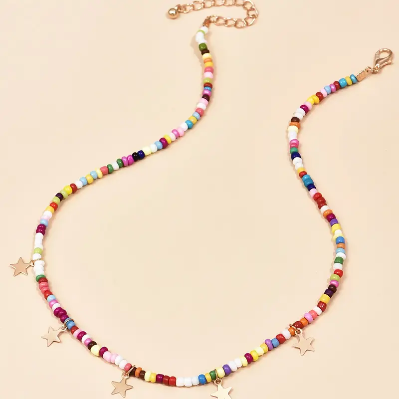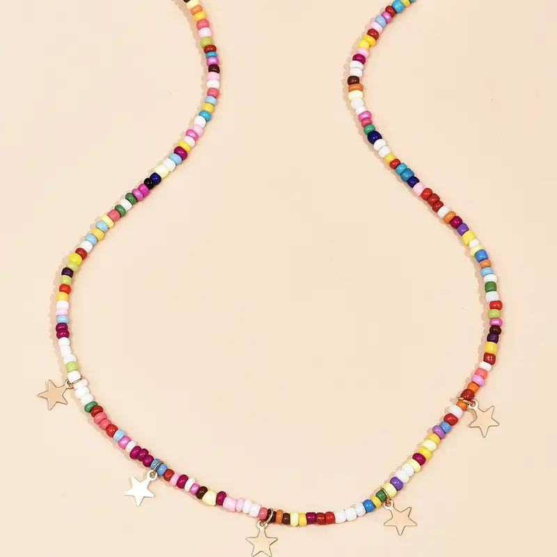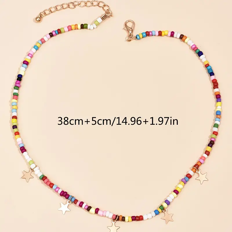 Carefully made with multicolor glass/plastic seed beads and a striking star pendant, reflecting the rising “boho-luxe” style—playful, expressive, and full of personality -