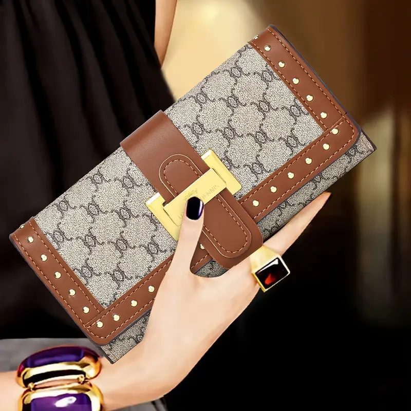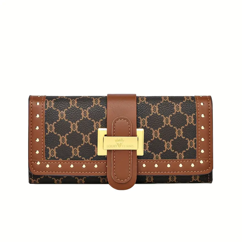 This stylish long clutch wallet features a classic retro geometric print on soft yet durable PU material. Designed as a trifold with a buckle closure, it offers an elegant, textured look ideal for mature women who appreciate sophisticated flair. Inside, faux leather lining and well‑organized compartments ensure both aesthetic appeal and practical function.
