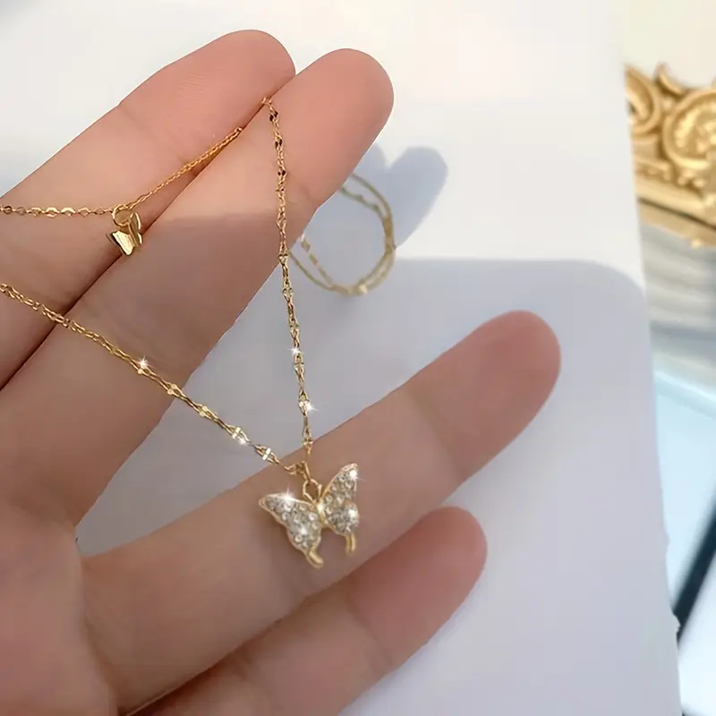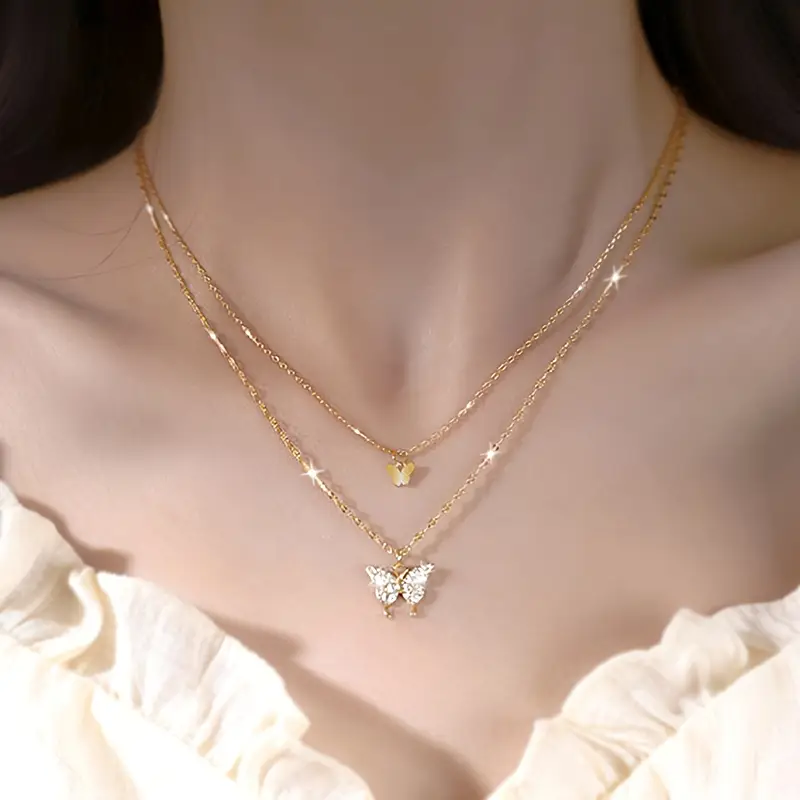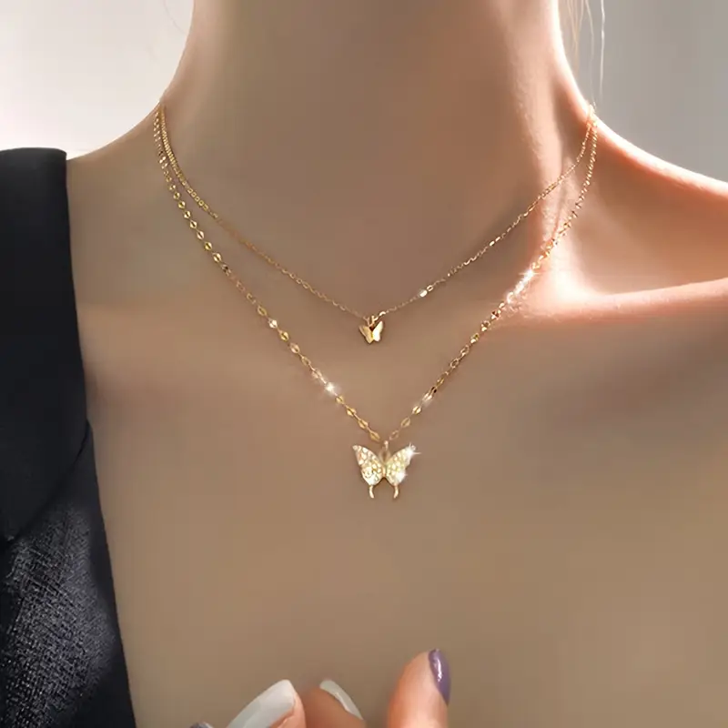 This Elegant Double‑Layered Butterfly Pendant Necklace pairs vintage charm with minimalist elegance. Crafted from polished alloy with delicate plating, the piece features two fine chains—one adorned with a tiny butterfly and the other carrying a larger rhinestone-inlaid butterfly pendant. The shimmering stones and graceful design make it perfect for daily wear or special occasions, seamlessly blending casual style with party-ready sparkle.