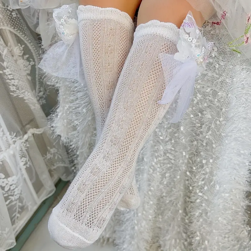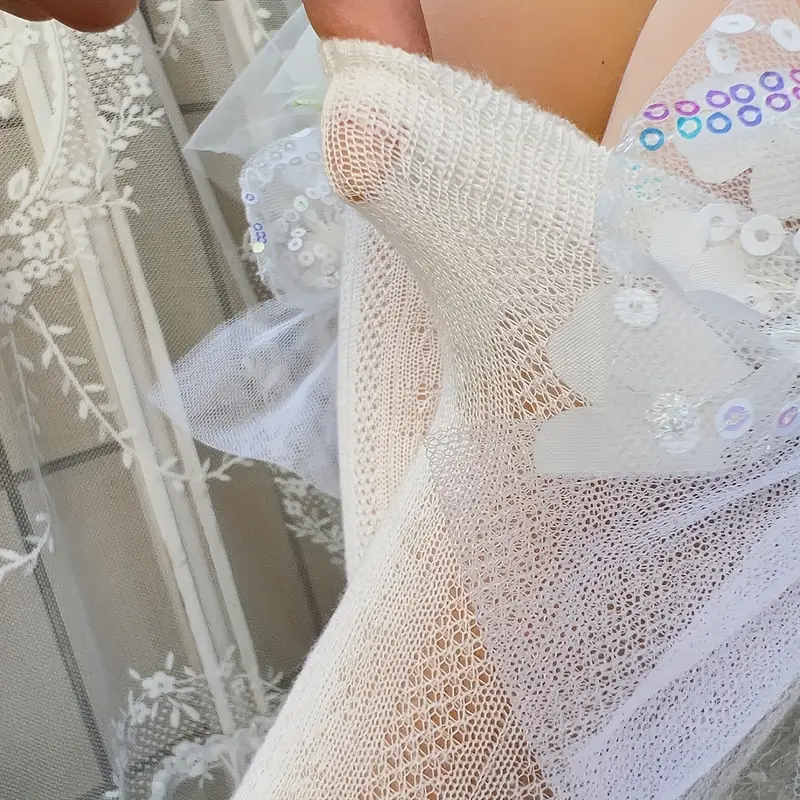 Make every step sparkle with these Sequin Pearl Bow Mesh Socks, a delightful accessory for girls 12 and under. Crafted from a soft 97% polyester and 3% spandex knit, each pair features mesh construction and a charming solid-color base adorned with shiny sequins and a pearl-trimmed bow. Hand-wash only for lasting beauty, they’re ideal for all-season wear—whether paired with ballet flats, sneakers, or party shoes.
